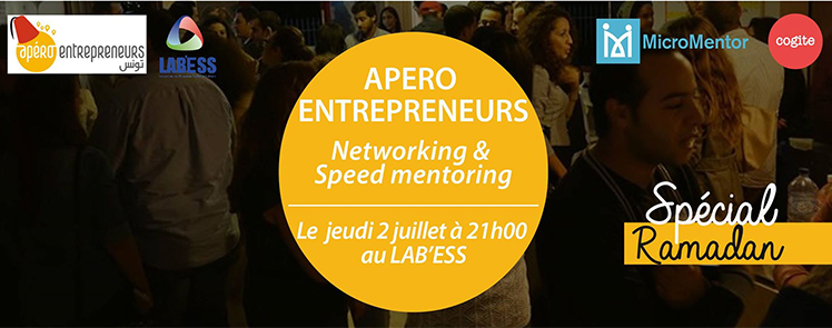 Apéro Entrepreneurs – Tunis vous propose une soirée spéciale ramadan en partenariat avec le Lab’ESS, Cogite Coworking Space et MicroMentor , le jeudi 2 juillet à partir de 21h00 dans les locaux du Lab’ESS- Laboratoire de l’Economie Sociale et Solidaire.