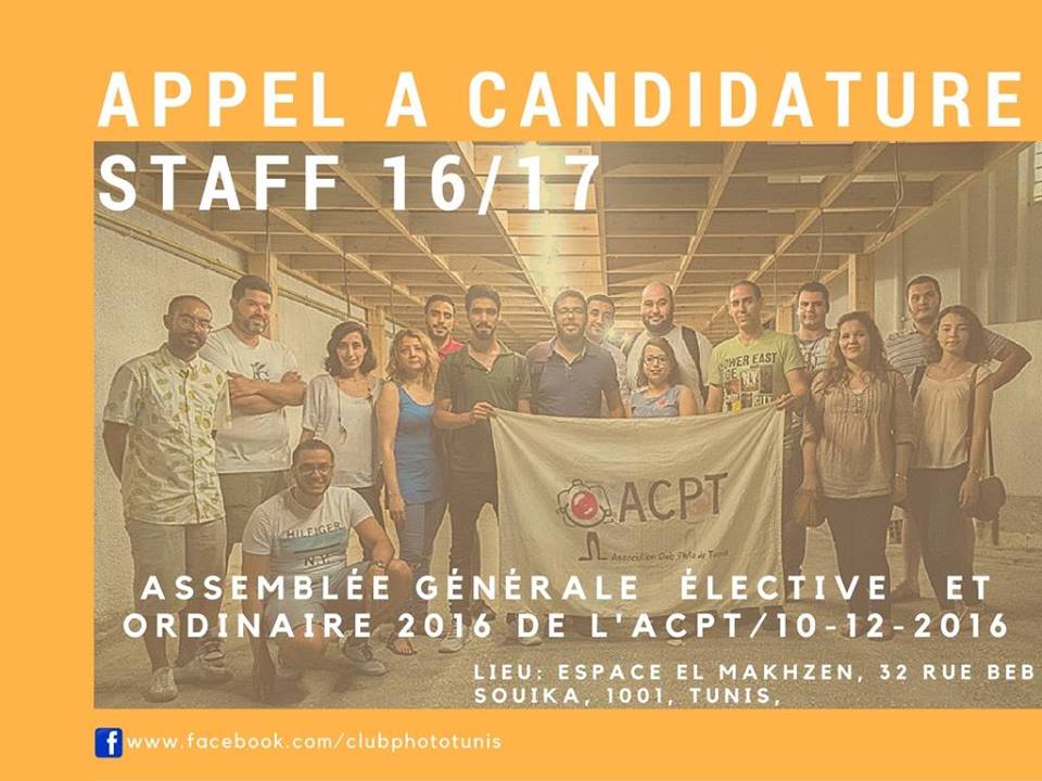 La liste des candidats pour des postes au sein du bureau exécutif de l’Association Club Photo de Tunis doit être envoyée à cette adresse email : [email protected], au plus tard le 03 Décembre 2016.