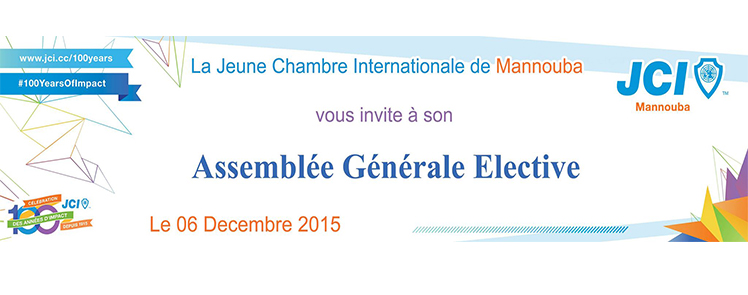 La Jeune Chambre Internationale de Manouba a l’immense plaisir de vous inviter à assister au déroulement des travaux de son Assemblée Générale Elective , qui aura lieu, le Dimanche 06 Décembre 2015, à Manouba Municipalité Denden , à 14h.