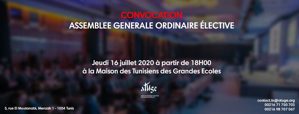 Le Conseil d’administration de l’ATUGE Tunisie est ravi de vous convier à l’Assemblée Générale Ordinaire Élective qui aura lieu le jeudi 16 juillet 2020 à 18h à la Maison des Tunisiens des Grandes Ecoles [Adresse : 5, Rue Al Moutanabi, Al Menzah 1, 1004, Tunis].
