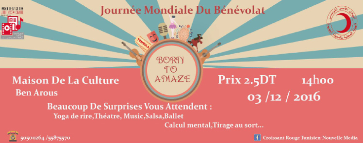تحت شعار « Born to amaze » وبمناسبة الاحتفال باليوم العالمي للتطوع إنطلقت الهيئة المحلية للهلال الأحمر التونسي بالمدينة الجديدة في تنظيم تظاهرة بالتعاون مع دار الثقافة ببن عروس، للتعريف بالهلال الأحمر التونسي وبالتحديد الهيئة المحلية وتحفيز حسّ التطوع والعمل الجمعياتي لدى الشباب و حثهم على تنمية مواهبهم الفنّية.
