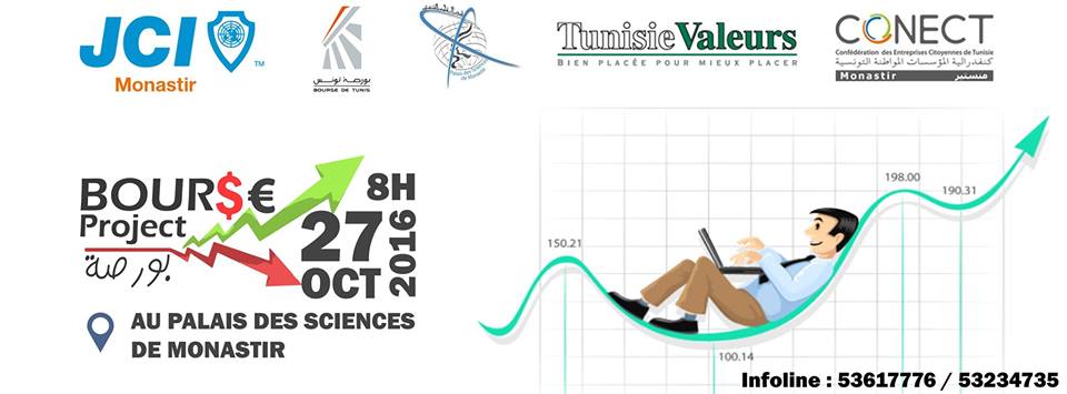 Dans le cadre de l’encouragement à l’investissement individuel et sociétaire, la jeune chambre économique de Monastir organise, en partenariat avec CONECT, la bourse des valeurs mobilières de Tunis (BVMT), Tunisie Valeurs et le palais des sciences, l’action « Bourse Project 2.0 » pour encourager l’investissement en bourse .