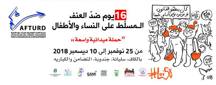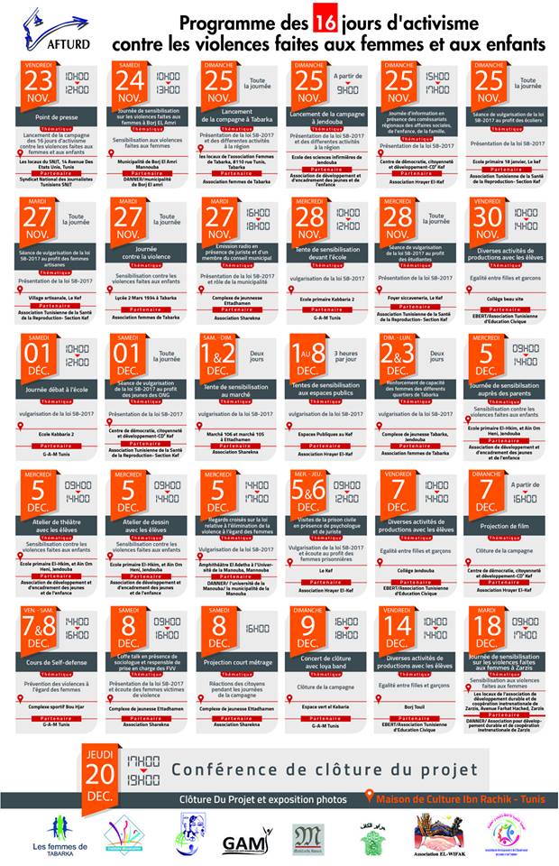 En partenariat avec les associations-relais à savoir : G-A-M Tunis, Sherekna, Femmes de Tabarka, ADEJE Jendouba, ATSR-KEF, Hrayer El-Kef et Maktaris news, plus de 30 activités sont prévues au cours des 16 jours d’activisme, dans les gouvernorats du nord-ouest : Siliana, Jendouba et le Kef et dans deux quartiers du Grand Tunis : El-Kabaria et Ettadhamen.