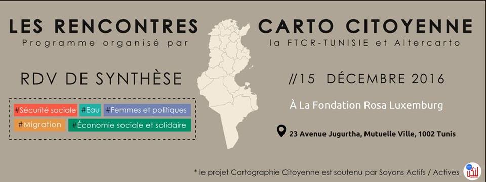 Depuis mai 2016, 5 rencontres Carto citoyennes ont eu lieu au siège de la Fondation Rosa Luxemburg, sur les thématiques suivantes : protection sociale, accès à l’eau, droits des femmes, migrations et économie sociale et solidaire. Ces 5 rencontres marquent le lancement de chantiers de cartographie collaborative, où on discute ensemble des données utiles, des moyens d’y accéder et de leurs usages. A côté de ces rencontres thématiques ont eu lieu des ateliers pratiques de familiarisation et de formation à l’outil de cartographie statistique.
