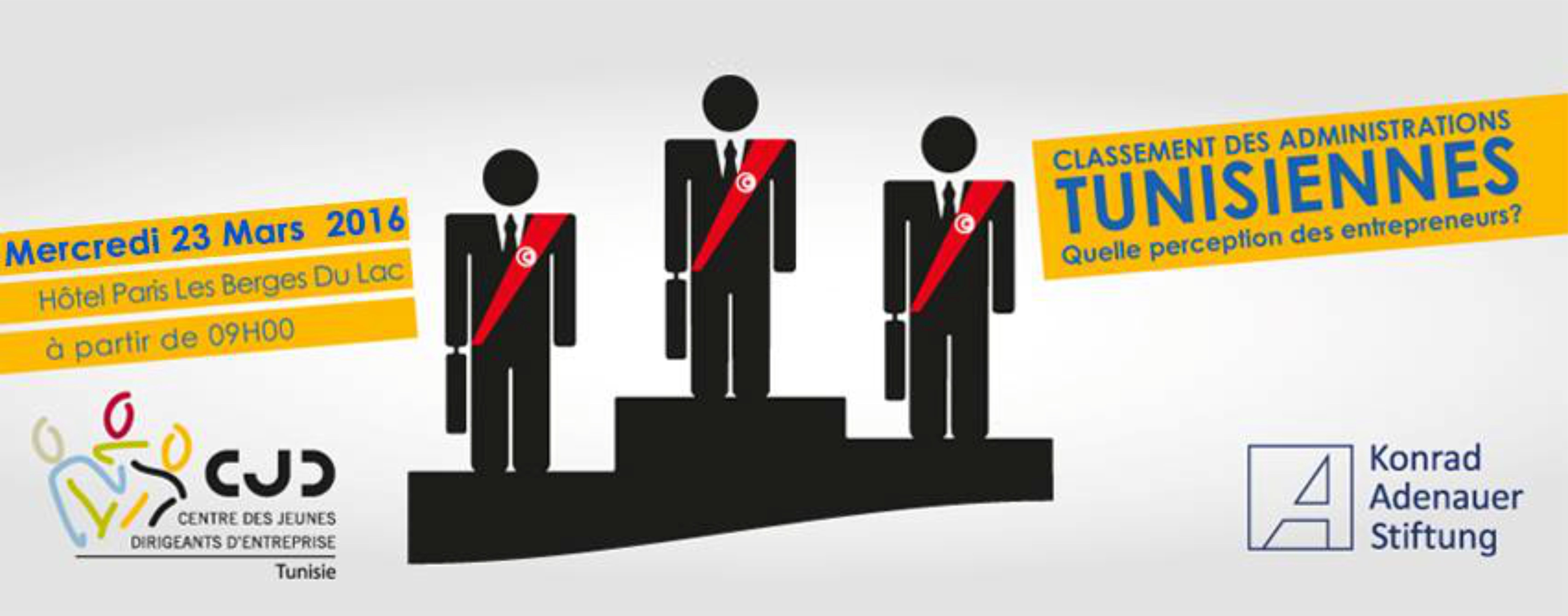 Le Centre des Jeunes Dirigeants d’Entreprise et la Konrad-Adenauer-Stiftung organisent, le 23 mars 2016 à l’Hôtel Paris – Les Berges du Lac à partir de 9h, un petit déjeuner débat sous le thème :  Classement des Administrations Tunisiennes.