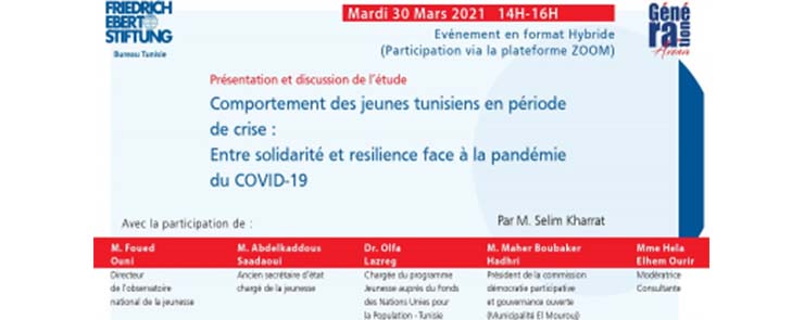 Quel est l’impact de la crise de la COVID-19 sur le comportement citoyen des jeunes et quel a été leur rôle dans le mouvement de solidarité mené par la société civile ? Quels rapports les jeunes entretiennent-ils avec les autorités et les acteurs de la société civile dans ce contexte de crise ? Quelles pistes d’actions politiques, institutionnelles et citoyennes pouvons-nous formuler afin de pérenniser le comportement solidaire ainsi que la résilience des jeunes au-delà de la période de crise ? Ce sont les questions auxquelles s’est proposée de répondre l’étude de la Friedrich-Ebert-Stiftung (FES) Tunisie intitulée « Comportement des jeunes tunisiens en période de crise : Entre solidarité et résilience face à la pandémie de COVID-19 » réalisée dans le cadre du programme Génération A’venir de la FES Tunisie par M. Selim Kharrat. Nous avons le plaisir de vous inviter à la conférence de présentation de l’étude qui aura lieu le 30 Mars 2021 à 14h en format hybride. Afin d’enrichir le débat et discuter les recommandations émises dans l’étude avec des représentant(e)s de différents acteurs concernés par la participation citoyenne des jeunes, la présentation de l’étude sera suivie par les interventions de nos invités d’honneur et la conférence se déroulera comme suit : 13H30 Ouverture de l’accès à la plateforme Zoom 14h00 Ouverture M. Thomas Absmayr Directeur du programme Génération A’venir auprès de la Friedrich-Ebert-Stiftung Tunisie 14h05 Présentation des résultats de l’étude « Comportement des jeunes tunisiens en période de crise : Entre solidarité et résilience face à la pandémie de COVID-19 M. Selim Kharrat Consultant 14h25 Discussion avec les participant(e)s autour de l’étude 14h45 Interventions des invités et discussion M. Foued Ouni Directeur de l’observatoire national de la jeunesse M. Abdelkaddous Saadaoui Ancien secrétaire d’état chargé de la jeunesse Dr. Olfa Lazreg Chargée du programme Jeunesse auprès du Fonds des Nations Unies pour la Population – Tunisie M. Maher Boubaker Hadhri Président de la commission démocratie participative et gouvernance ouverte (Municipalité El Mourouj) 15h30 Débat avec les participant(e)s 16h Clôture Modératrice : Mme Hela Elhem Ourir Consultante Cet événement se tiendra en langue française (avec interprétariat simultanée des interventions en arabe vers le français) et en format hybride (participation via la plateforme Zoom). Pour participer, veuillez suivre le lien suivant : https://zoom.us/j/96251976411 La conférence sera diffusée en live streaming sur la page Facebok de la Friedrich-Ebert-Stiftung Tunisie