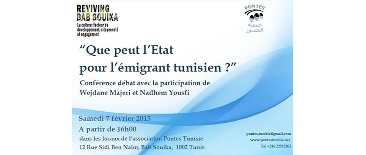 L’association Pontes Tunisie organise dans le cadre de son projet « Reviving Bab Souika : la culture facteur de développement, citoyenneté et engagement » le 7 février 2015 une Conférence Débat sous le titre «Que peut faire l’Etat pour l’émigrant tunisien ?» avec la participation de Wejdane Majeri, professeure à l’Ecole Polytechnique de Milan, présidente de l’association PONTES Italie et de l’historien Nadhem Yousfi, Université de Nice-Sophia Antipolis.