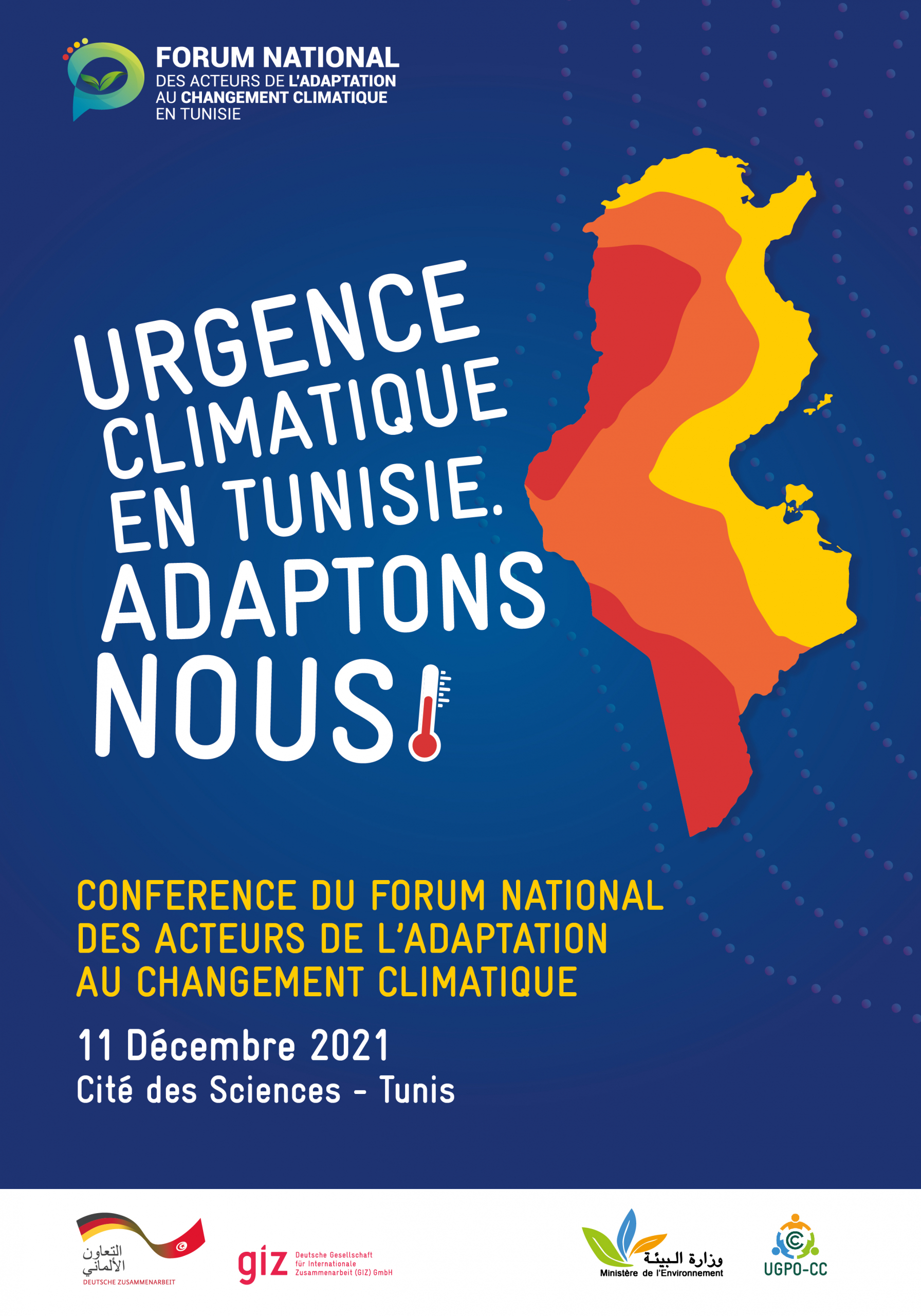 Cette conférence, aura lieu le 11 décembre 2021, à la Cité des Sciences – Tunis et elle sera un point de rencontre et de dialogue entre les acteurs nationaux de l’adaptation au changement climatique pour mettre en valeur les différentes initiatives, réalisations et contributions en la matière.