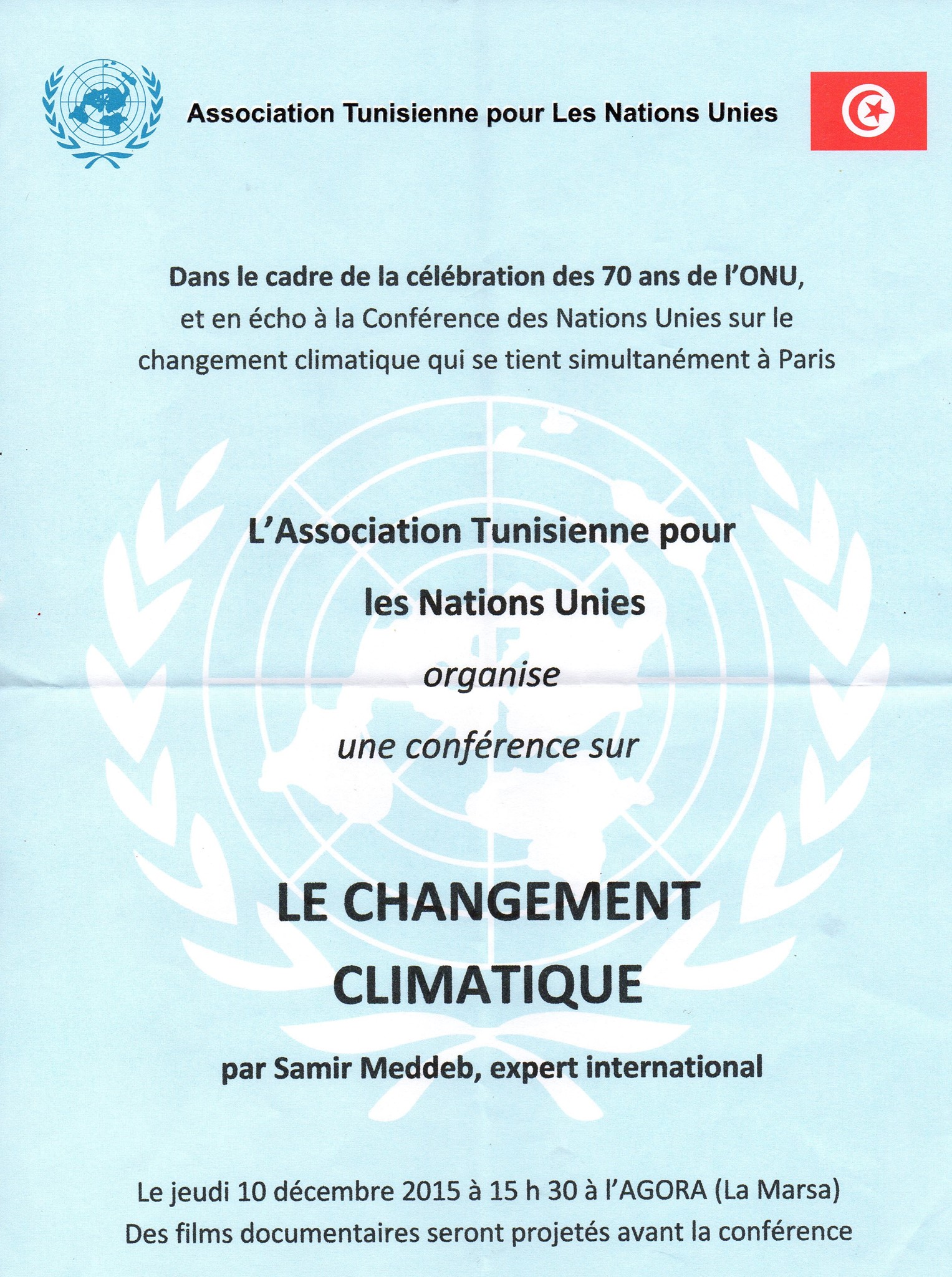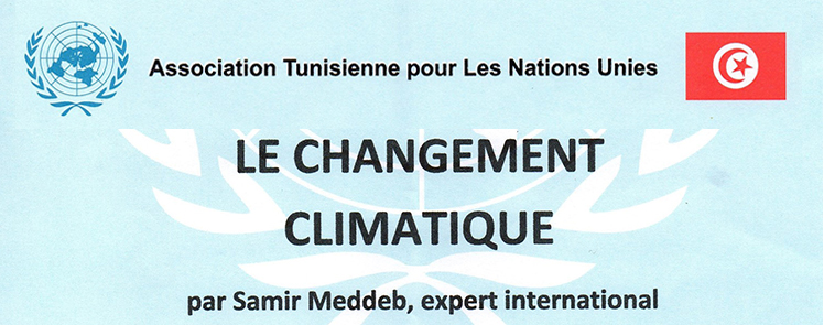 L’Association Tunisienne pour les Nations Unies (ATNU) organise le Jeudi 10 Décembre 2015 à 15h30 à l’Agora de La Marsa une conférence sur le changement climatique en marge de la Conférence de Paris sur le Changement Climatique (COP21) pour sensibiliser la société civile tunisienne aux enjeux climatiques et aux défis qui se présentent pour la Tunisie.
