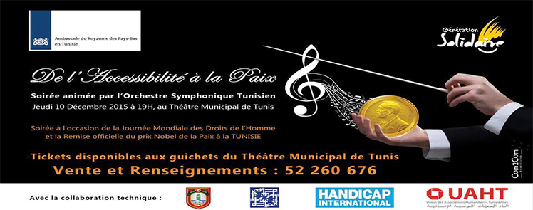 A l’occasion de la Journée Mondiale des Droits de l’Homme et la Remise officielle du prix Nobel de la Paix à la Tunisie, l’ambassade du Royaume des Pays-Bas en Tunisie et l’Association Génération Solidaire organisent une soirée musicale  » De l’Accessibilité à la PAIX  » animée par l’Orchestre Symphonique Tunisien. Et ce, le Jeudi 10 Décembre 2015 à partir de 19H au Théâtre Municipal de Tunis.