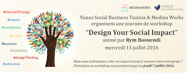 Nous sommes ravis de vous inviter à « Design Your Social Impact » workshop, organisé en collaboration entre Yunus Social Business Tunisia et Medina Works représenté par Rym Baouendi, et ce le mercredi 13 juillet de 10h à 17h00 (à Tunis Central, TBA).