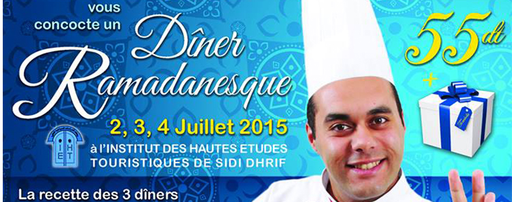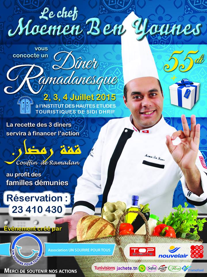 L’association « Un Sourire Pour Tous » organise les 02,03 et 04 juillet 2015 des dîners ramadanesques à l’Institut des Hautes Études Touristiques de Sidi Dhrif sous la direction du chef « Moemen BEN YOUNES » et avec la présence de personnalités célèbres en Tunisie (Lotfi Bouchnek, Mohamed Gammoudi,…).