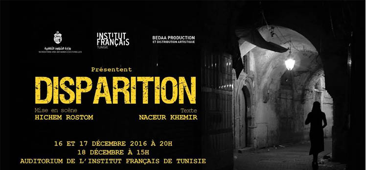 « Disparition » est la nouvelle pièce de théâtre de Hichem Rostom qui se jouera dans les locaux de l’Institut Français de Tunisie, les 16 et 17 décembre à 20h et le 18 décembre à 15h. Avec l’appui du Ministère des affaires culturelles -Tunisie وزارة الشؤون الثقافية – تونس et de l’Institut Français de Tunisie, « Disparition » est une production de BEDAA PRODUCTION.