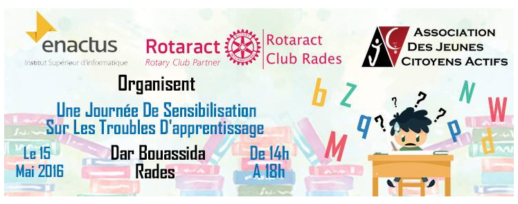 لي عندو وإلا يعرف صغير عندو مشكلة في التعلم ينجم يجي معانا على خاطر Enactus ISI و Al Amine DYS Care Center، وإلي هو مركز متخصص يقدم علاج للصغار إلي عندهم صعوبات واضطرابات في التعلم و غيرها من الاحتياجات مع Rotaract Rades و AJCA Rades نوفرولك فرصة باش نفهموا مع بعضنا الأسباب العلمية ألي يواجهها صغارنا في حياتهم الأكاديمية وفي نفس الوقت بش يحضر معانا خبراء في تقويم النطق وخبراء اجتماعين ونفسين بش يوضحوا الحلول العملية في الحالات هاذية.