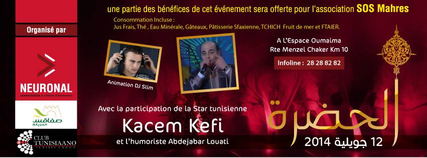 A l’occasion du mois de Ramadan, les associations Neuronal, Club Tunisiano et association Sfax El Meziana organisent une agréable soirée de Hadhra qui sera animée par le chanteur Kacem Kafi et l’humoriste Abdel Jabbar Louati.