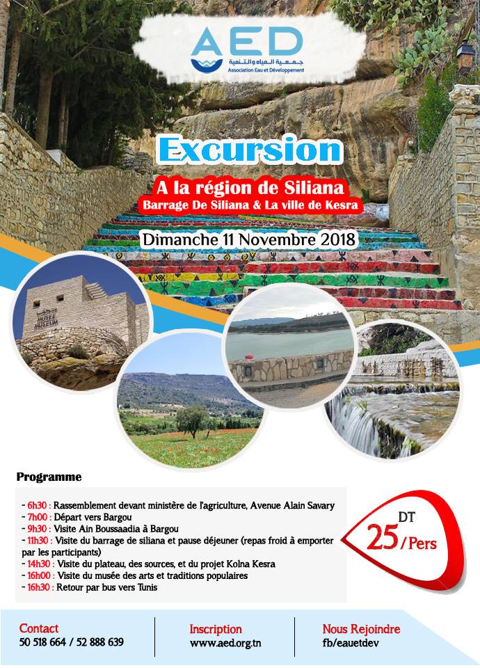 L’Association Eau et Développement (AED) organise le Dimanche 11 Novembre 2018 une excursion à Siliana pour visiter Ain Bousaadia, Barrage de Bergou, musé et plateau de Kesra.