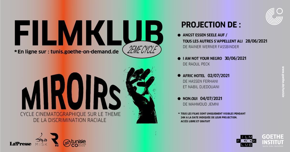 Le Goethe-Institut Tunis organise le second cycle « Filmklub » intitulé « Miroirs » en proposant au grand public la projection de 4 films, en accès libre et gratuit ,autour du thème de la discrimination raciale.