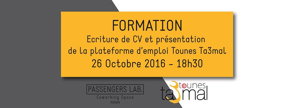 Tounes Ta3mal et Passengers Lab. coworking space ont le plaisir de vous annoncer la tenue d’une formation en écriture de CV ainsi qu’une présentation de la plateforme d’emploi www.tounesTa3mal.com.