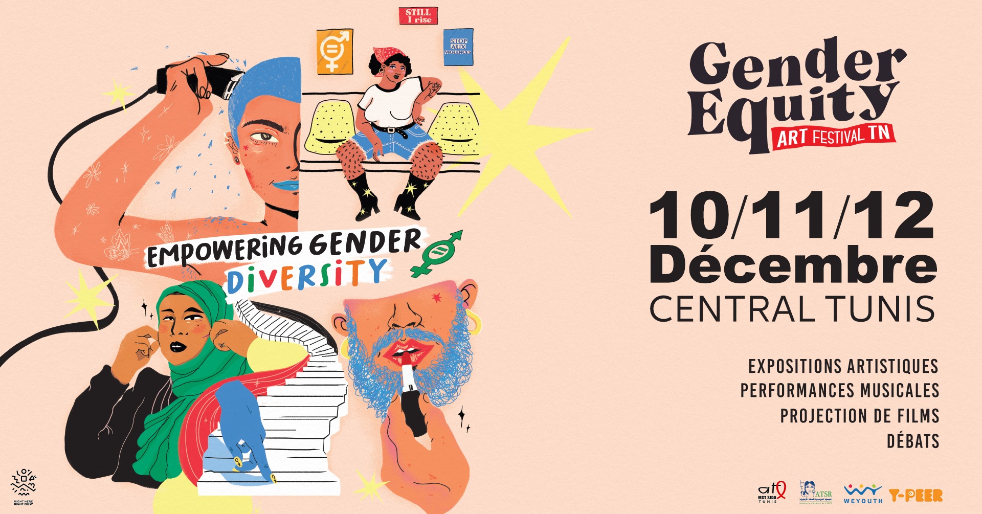 Dans le cadre du projet Right Here Right Now 2, ATL MST SIDA TUNIS organise la première édition du « Gender Equity Art Festival TN » à l’occasion des seize jours d’activisme contre les violences basées sur le genre. Le festival a pour objectif de sensibiliser à la violence fondée sur le genre et de la reconnaître comme une violation des droits humains, de promouvoir l’équité et de lutter contre les stéréotypes.