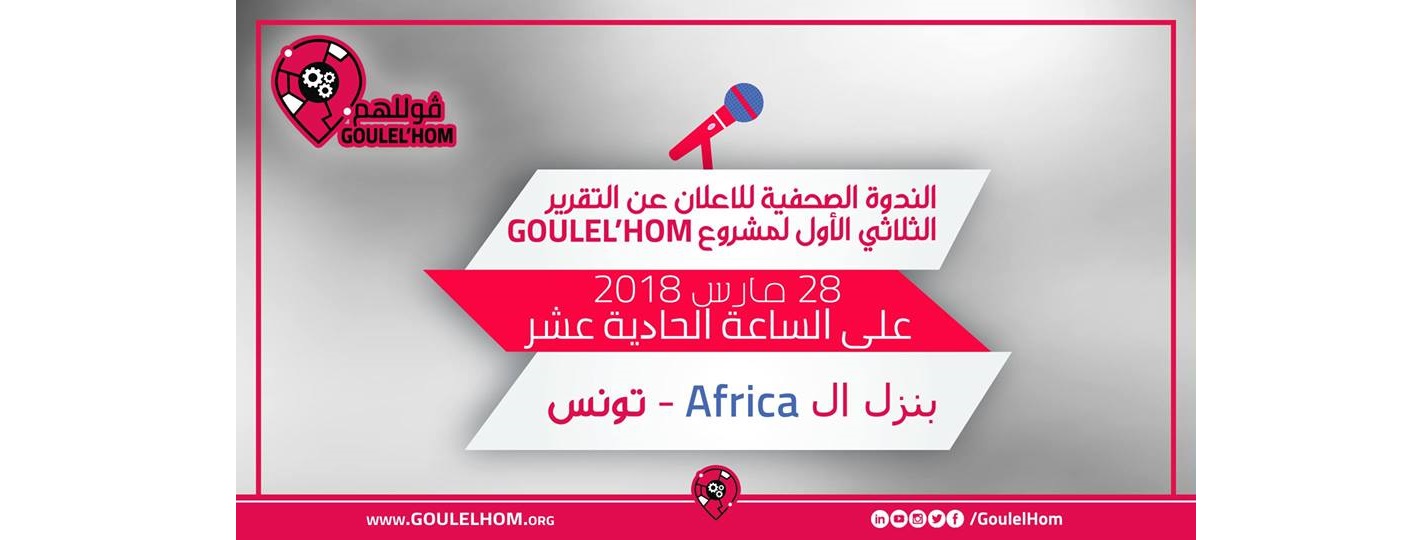 تنعقد يوم الإربعاء 28 مارس 2018 بنزل الأفريكا ندوة صحفية لعرض تقرير الثلاثي الأول لمشروع ڨوللهم GOULEL’HOM- وذلك بحضور ممثلي بلديات ولاية تونس ومواطنين لتقديم شهادات تخص أهم القضايا التي تطرق إليها فريق ڨوللهم