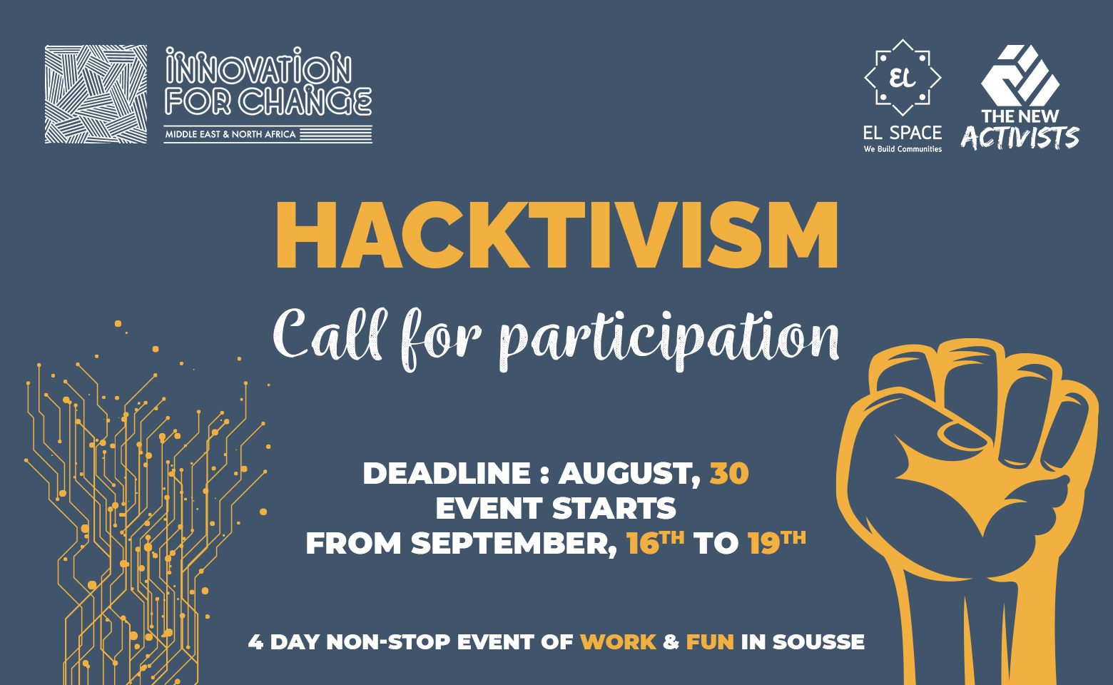 As part of its program The New Activists, EL Space is organizing the third activity: The Creative Activism Hackathon. It is a 4 day- Hackathon that brings together activists, technologists and entrepreneurs to prototype innovative technology solutions addressing civil society and human rights issues in Tunisia.