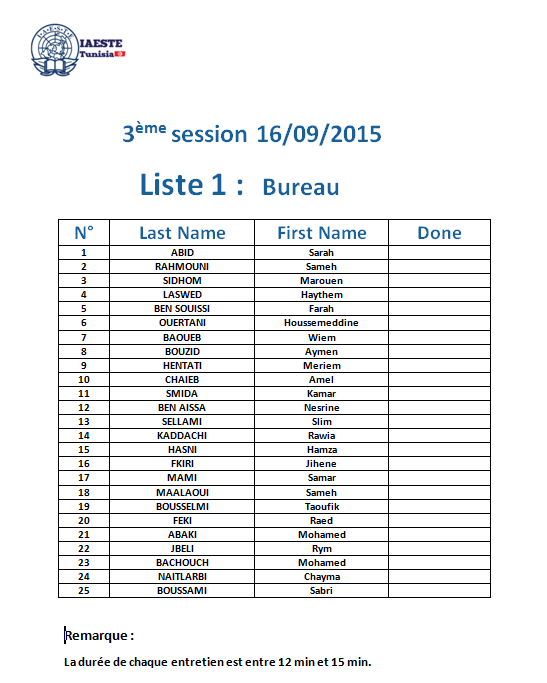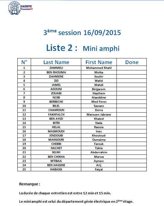 For this year, IAESTE Tunisia invites all of the 1st year ENIT Students to take an interview on the 16 of September 2015 in IAESTE Tunisia office.