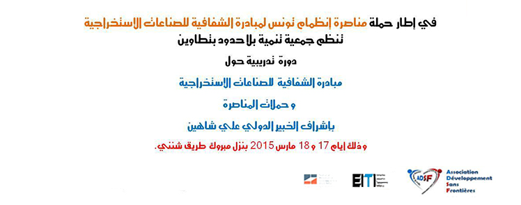 جمعية تنمية بلاحدود في تطاوين تدعو الحكومة التونسية الى المصادقة على مبادرة الشفافية في الصناعات الاستخراجية . أطلقت جمعية تنمية بلا حدود في تطاوين منذ أيام ، نشاطتها ضمن برنامج مناصرة انضمام تونس لمبادرة الشفافية للصناعات الاستخراجية .و في إطار هذه الحملة ستشرف الجمعية على دورة تكوينية لعدد من الجمعيّات وناشطي المجتمع المدني أيام 17 و 18 مارس 2015 بنزل مبروك طريق شنني تطاوين و ذلك للتعريف بالمبادرة و شرح كيفية القيام بحملات المناصرة. وتهدف الجمعية من خلال نشاطها الى الضغط على الحكومة التونسية حتى تصادق على مبادرة الشفافية الدولية في الصناعات الاستخرجية بحسب ما ذكره رئيس جمعية تنمية بلاحدود في تطاوين ، فتحي بوشيبة في تصريح ل _(وات)- ويشمل المشروع كل من ولايات تطاوين ، قابس ،القيروان ، قفصة ، وتونس مع تكليف جمعيات للقيام في هذه الحملة في كل من الولايات المذكورة. ويشرف على هذا المشروع معهد حوكمة الموارد الطبيعية الأمريكي ، ويستهدف بالأساس تركيز آليات رقابة قانونية بما يضمن الحوكمة الرشيدة في الصناعات الاستخراجية بتونس . وتستأنف التظاهرة نشاطها خلال هذا الشهر ، بدورات تكوينية مع ظبطها لجلسة حوار في آخر هذا الشهر مع اطلاق حملة تواقيع شهري أفريل وماي القادمين .
