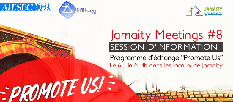 Jamaity en partenariat avec AIESEC Carthage – Tunisia organisent une session d’information le lundi 6 juin à partir de 11h00 dans les locaux de Jamaity afin de présenter le programme d’échange Promote Us.
