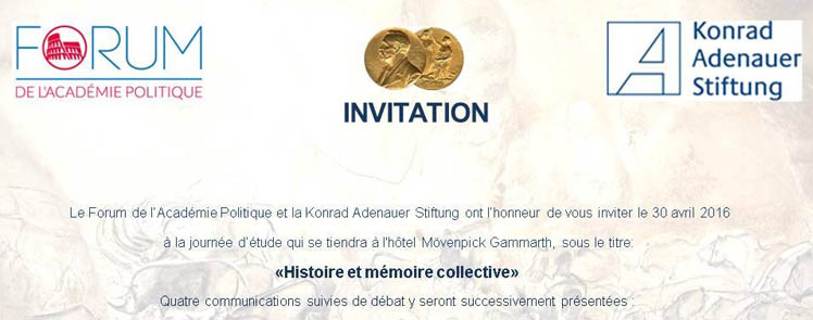 Le Forum de l’Académie Politique – Konrad Adenauer Stiftung organise une journée d’étude sous le thème « Histoire et mémoire collective » qui se tiendra le 30 avril 2016.