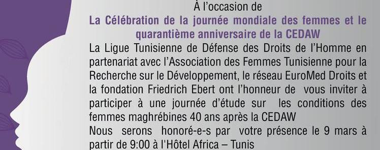 A l’occasion de la Célébration de la journée mondiale des femmes et le quarantième (40e) anniversaire de la CEDAW, la الرابطة التونسية للدفاع عن حقوق الانسان الصفحة الرسمية Ltdh, en partenariat avec l’ AFTURD, l’EuroMed Rights – Tunisia et la Friedrich-Ebert-Stiftung Tunisie ont l’honneur de vous inviter à participer à une journée d’étude sur les conditions des femmes maghrébines 40 ans après la CEDAW et ce le Samedi 9 Mars 2019 à partir de 9h à l’Hôtel Africa Tunis
