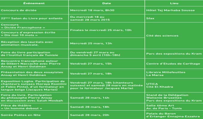 Les Journées de la Francophonie proposent un concours d’écriture en langue française à Tunis, des séances de signatures, des rencontres avec des auteurs français ou francophones, des ateliers, des expositions et des conférences et ce à l’occasion de la Foire internationale du livre.