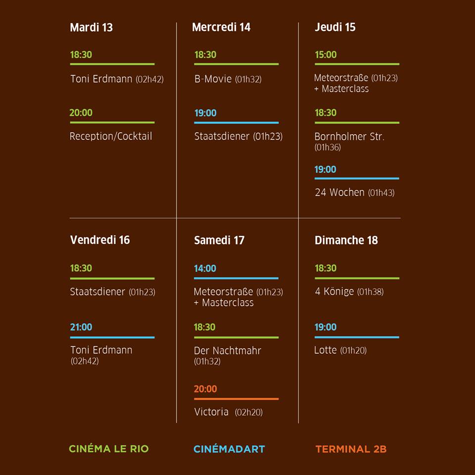Du 13 au 18 décembre vous avez l’occasion de voir des actualités du cinéma allemand, fraichement sorties, dont quelques-uns étaient en début d’année projetés au festival Berlinale à Berlin. Notre sélection englobe des films comme Toni Erdmann (2016), B-Movie – Lust&Sound in Westberlin (2015), Staatsdiener (2015), Bornholmer Straße (2014), 24 Wochen (2016) ou 4 Könige (2015) que vous pouvez voir au cinémaLe Rio à Tunis et au CinéMadart à Carthage.