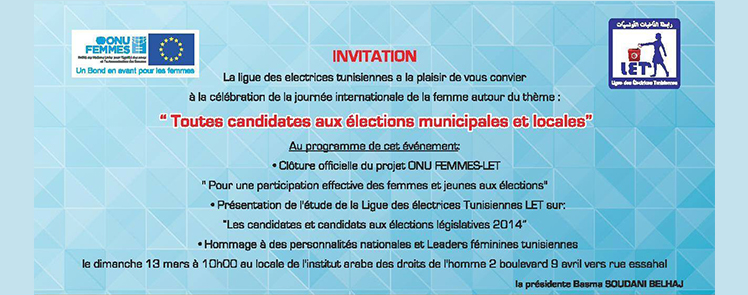 A L’occasion de la célébration de la journée mondiale de la Femme Sous le thème « Toutes candidates aux élections municipales et locales » La Ligue des Electrices Tunisiennes, va organiser dimanche 13 Mars 2016 du 9h à 15h30 à l’Institut Arabe des Droits de l’Homme « Dar Essaida » la cérémonie de clôture officielle du projet « Pour une participation effective des femmes et des jeunes aux élection », en partenariat avec ONUFEMMES et avec le soutien financier de l’Union Européenne ,en présence de la Représentante d’ONU Femmes en Tunisie, et de l’UE ainsi que plusieurs personnalités féminines de la société civile et de syndicalistes tunisiennes.