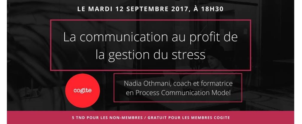 Joignez vous à nous le Mardi 12 septembre 2017 à 18H30 à Cogite Coworking space pour une session dédiée à « la communication au profit de la gestion du stress »: Comment gérer les conflits et les malentendus en adaptant sa communication selon le profil de son interlocuteur. » avec Nadia Othmani, coach et formatrice en Process communication Model.