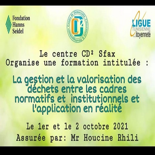Le Centre CD² Sfax organise une formation intitulée : « La gestion et la valorisation des déchets : entre les cadres normatifs et institutionnels et l’application en réalité ». Elle sera assurée par Mr. Houcine Rhili, et se dérulera le 1er et le 02 octobre 2021 (entre 9h et 13h30 chaque jour) au centre CD² Sfax situé au 06, rue zahra, Al bosten, Sfax (cliquez ici: https://goo.gl/maps/baY8hPVm6hn5gJBz9 )