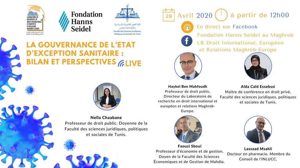 Afin de participer au débat actuel sur la crise du Covid-19 et ses répercussions, le Laboratoire de recherche en droit international, européen et relations Maghreb-Europe (LR-DIERME) avec le soutien de la Fondation Hanns Seidel organisent le 29 avril 2020, de 12:00 à 14:00, un webinaire sur le thème: