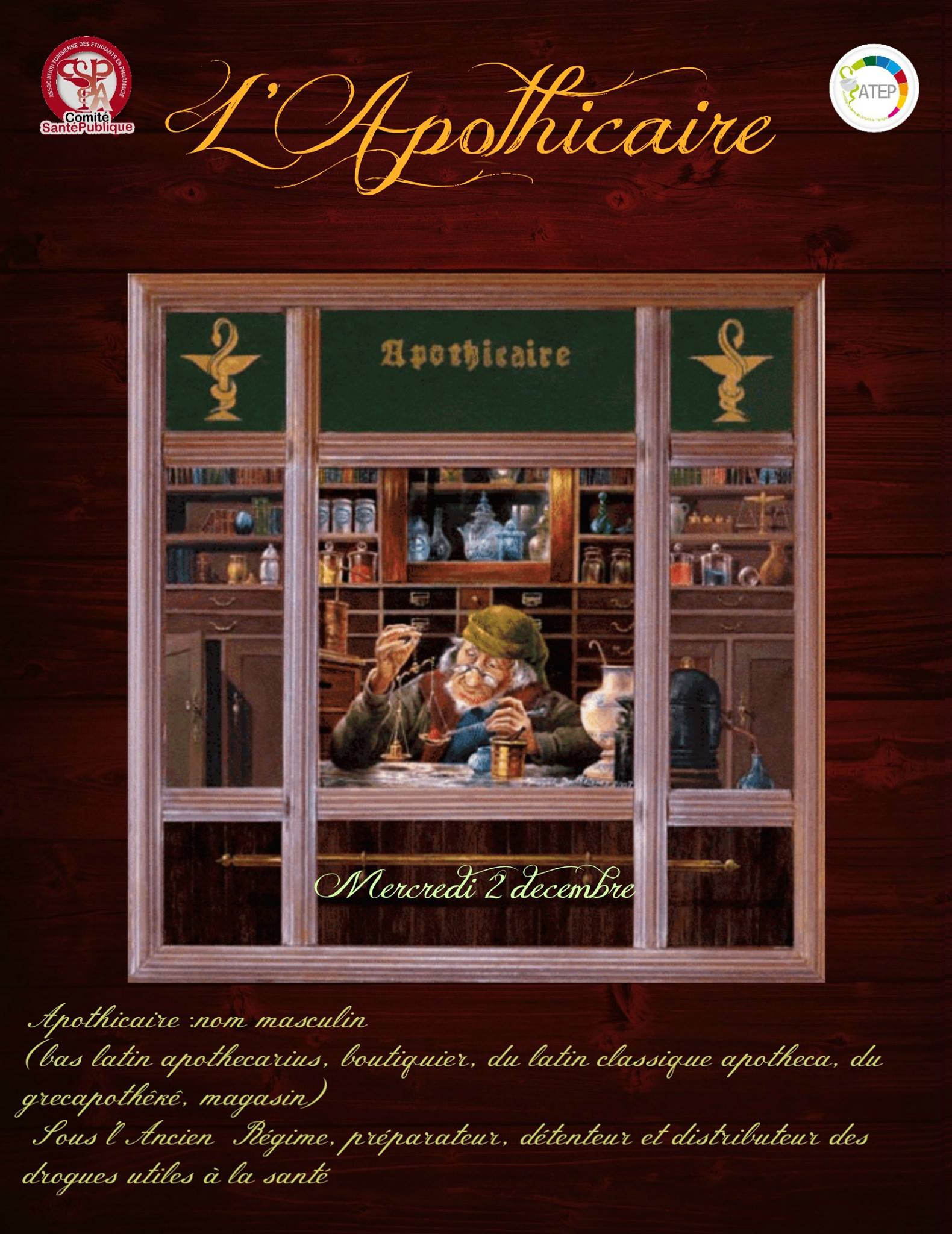 L’apothicaire , notre grand père vous revient dans le cadre d’une journée de médecine traditionnelle organisée par le comité santé publique de l’association tunisienne des étudiants en pharmacie.