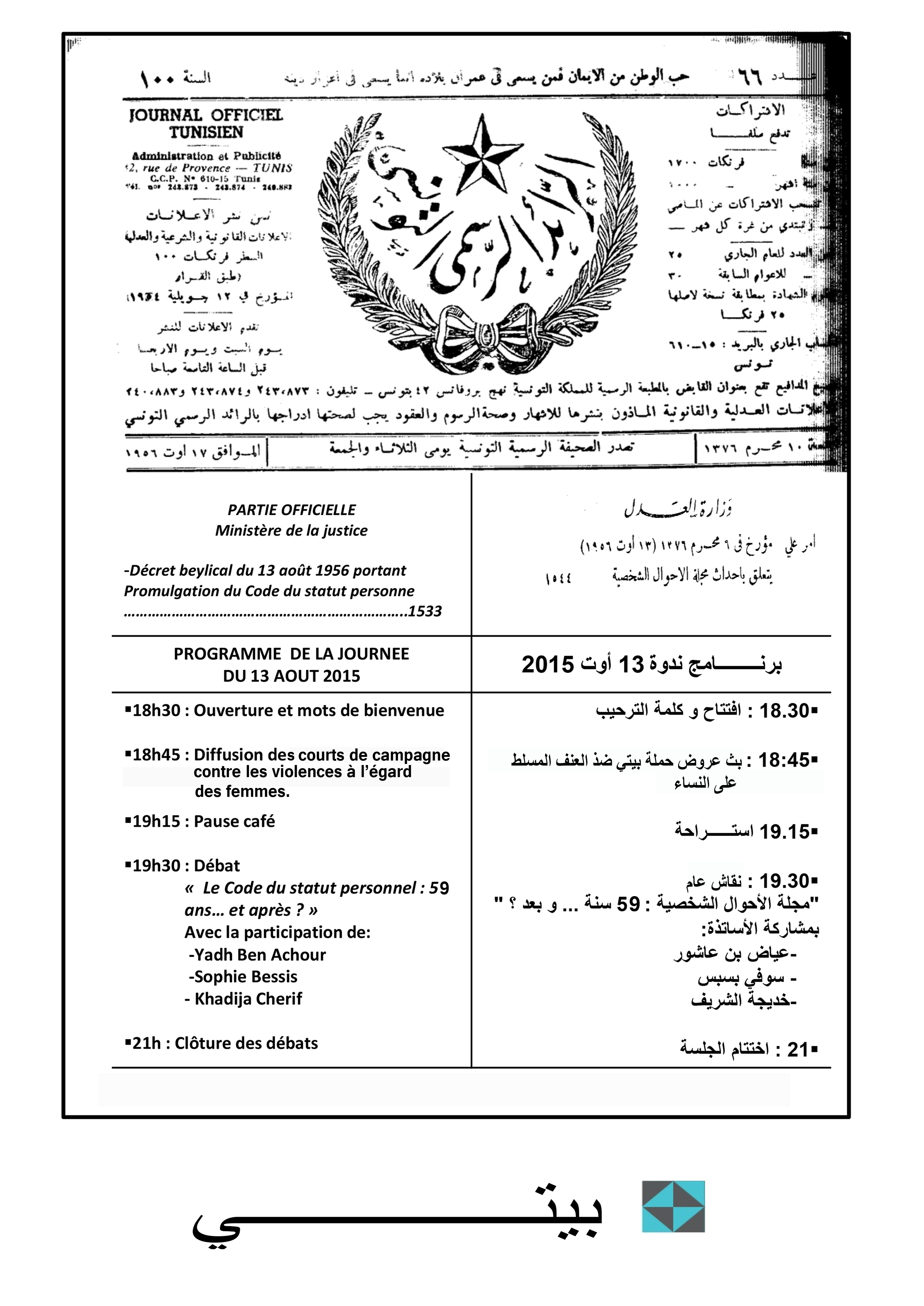 Nous avons le plaisir de vous inviter à la rencontre débat que BEITY organise le jeudi 13 août 2015 à LAGORA à la Marsa à 18h30 sur le thème » le code du statut personnel : 59 ans… et après ? » avec la Participation de Yadh Ben Achour, Sophie Bessis et khadija Chérif. La séance sera assortie de la projection des courts métrages de la campagne de BEITY contre les violences à l’égard des femmes.