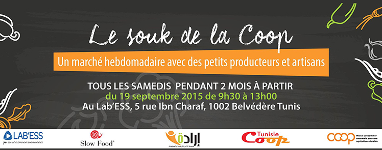 Tunisie Coop organise un marché ouvert hebdomadaire de produits agricoles, le « Souk de la Coop », tous les samedis pendant deux mois à partir du 19 septembre au Lab’ESS de 9h30 à 13h00 .