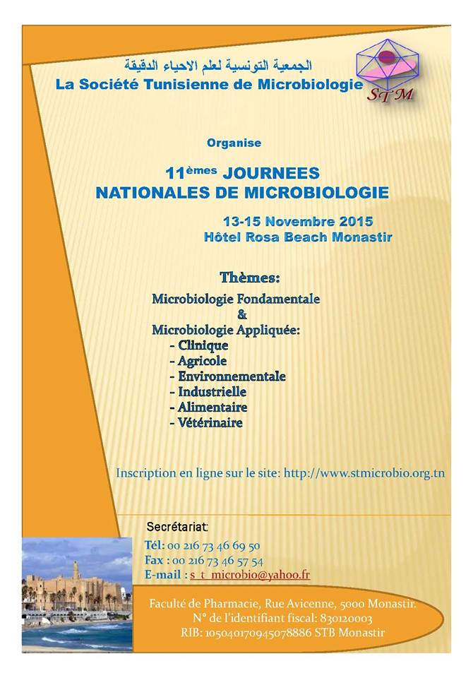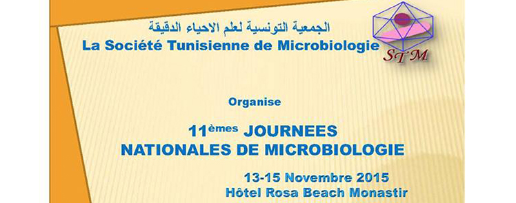 Le bureau de la Société Tunisienne de Microbiologie vous annonce la tenue de ses 11èmes Journées Scientifiques du 13 au 15 Novembre 2015 à l’hôtel Rosa Beach, à Monastir.
