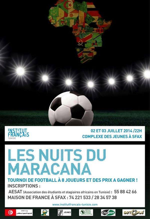 Dans le cadre du cycle « À l’heure du Mondial », la Maison de France à Sfax, en partenariat avec l’Association des Étudiants et Stagiaires Africains de Tunisie (AESAT) et le Commissariat de la Jeunesse et des Sports, a le plaisir d’organiser les « Nuits du Maracana » du 2 au 3 juillet 2014 au Complexe des Jeunes de Sfax.