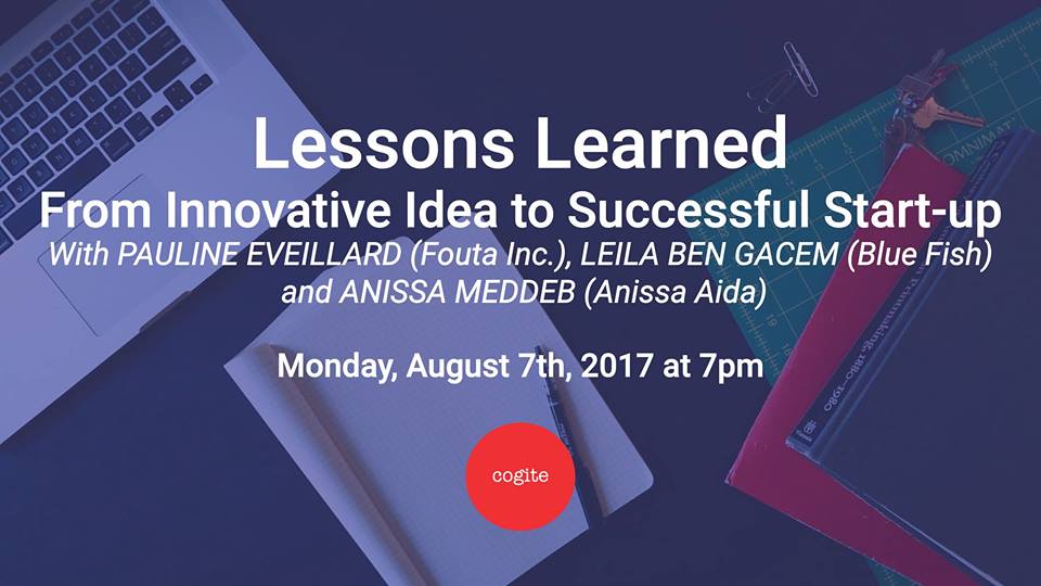 Join us on Monday, August 7th at 7pm for our next exciting panel discussion titled: « Lessons learned: From innovative idea to successful Start-up » with Pauline Eveillard (Fouta Inc.), Leila Ben Gacem (Blue Fish) and Anissa Meddeb (Anissa Aida).