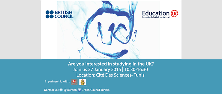 Le British Council en Tunisie accueillera « The Maghreb Education UK Tour 2015 » pour les étudiants qui sont désireux de poursuivre leurs éducation en Grande Bretagne. La manifestation aura lieu du 27 Janvier 2015 a la Cite Des Sciences de 10h30 à 16h30 et elle est ouverte au grand publique.