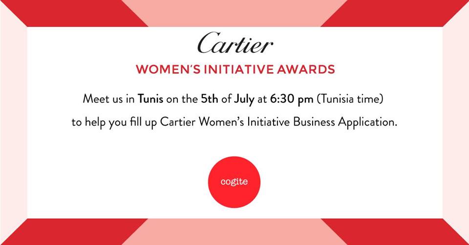 Meet the Cogite team in Tunis on the 5th of July from 6:30 pm (Tunis time) at Cogite, 1 Rue Tahar Haddad, 1053, Tunisia to help you fill up Cartier Women’s Initiative Business Application, to learn more and answer all your questions on the Initiative.