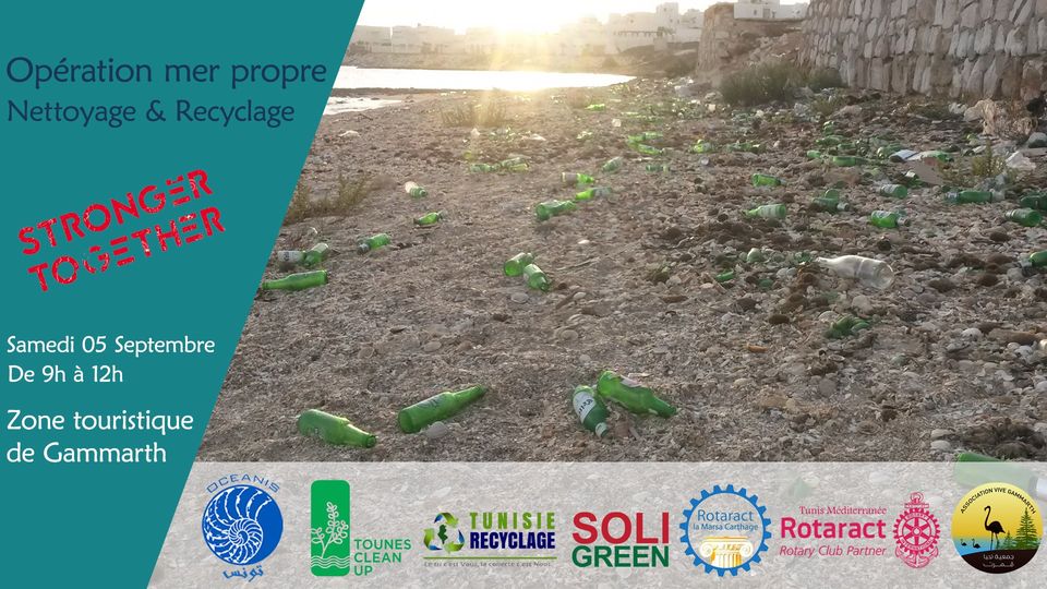 Nous vous invitons à nous rejoindre nombreux pour cette campagne de nettoyage et de recyclage qui sera axée sur les bouteilles en verre et ce, le Samedi 5 Septembre, de 9h du matin à 12h à la plage de la zone touristique de Gammarth.