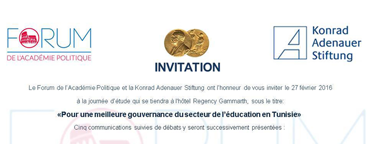 Bonsoir,Le Forum de l’Académie Politique et la Konrad-Adenauer-Stiftung offrent, lors de la journée d’étude qu’ils organisent sur le thème : «Pour une meilleure gouvernance du secteur de l’éducation en Tunisie» à l’hôtel Regency Gammarth, le 27 février 2016, aux associations à vocation éducative un espace d’exposition (une table et deux chaises) qui leur permettra de présenter leurs services.