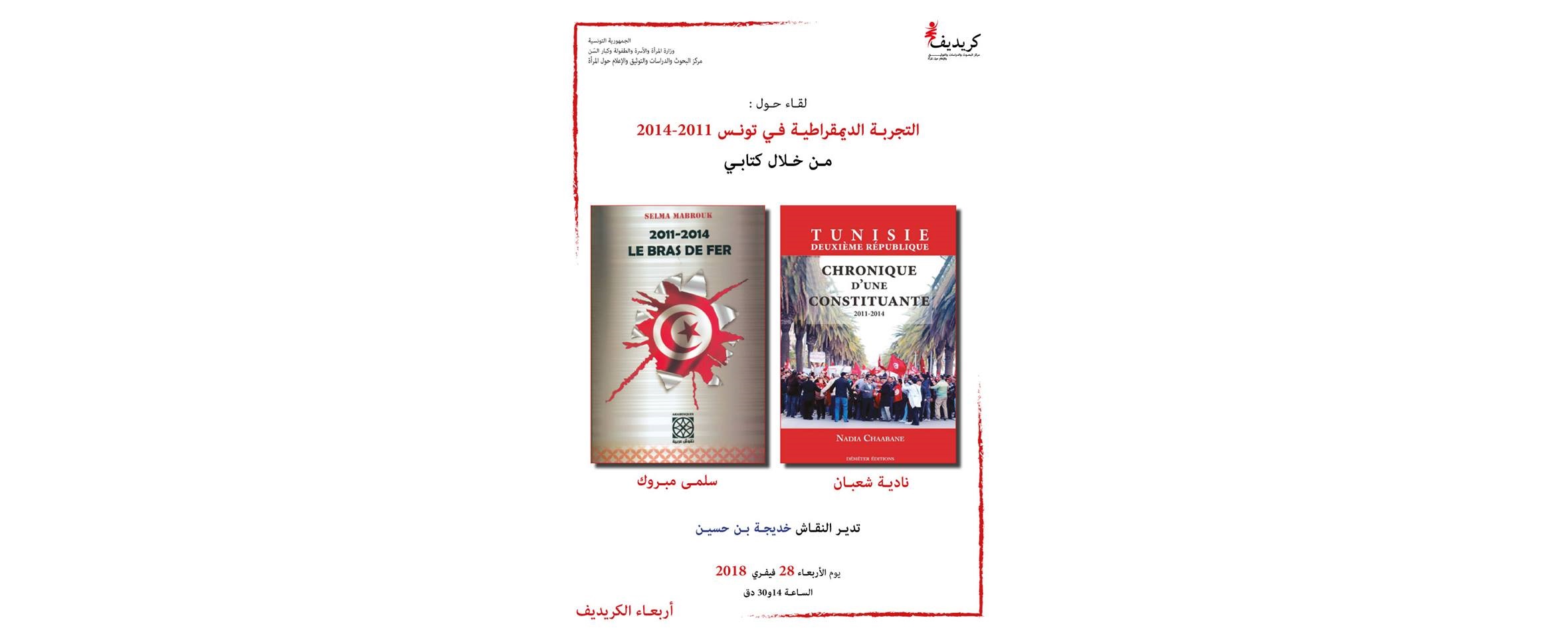 يشرفنا دعوتكم لمواكبة اللقاء الحواري الذي ينظمه الكريديف في إطار سلسلة إربعاء الكريديف حول : « التجربة الديمقراطية في تونس2011-2014″ وذلك من خلال تقديم كتابي