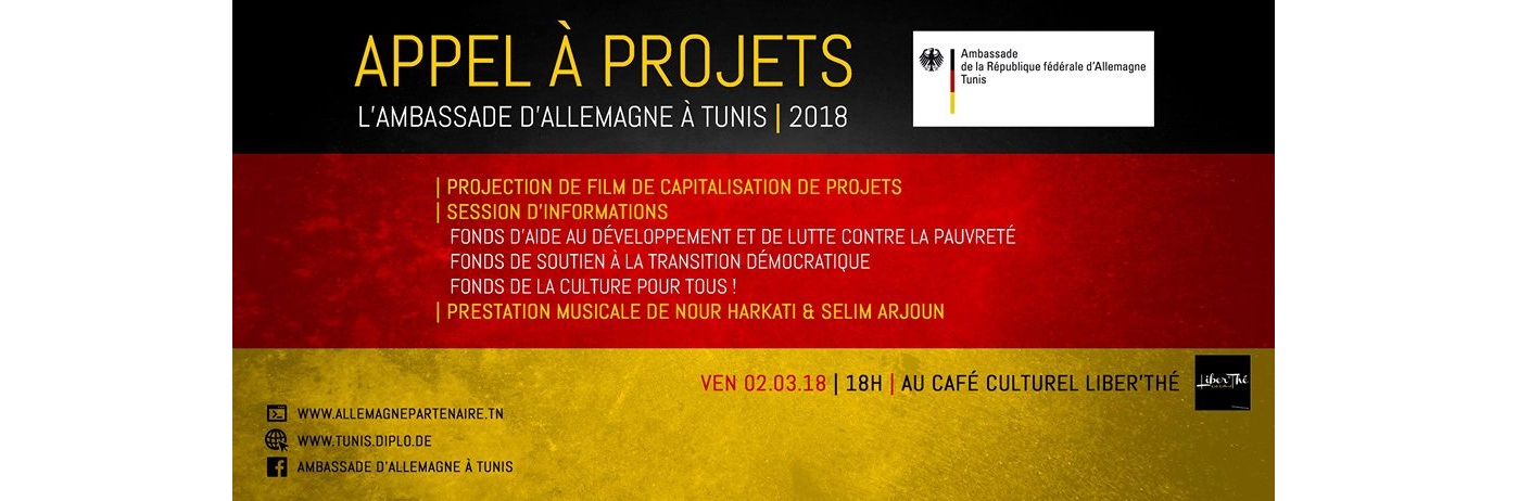 L’Ambassade d’Allemagne à Tunis en partenariat avec le Café Culturel Liber’Thé organise une session d’information au profit des associations tunisiennes autour du lancement de ses trois appels à projets. Les personnes désirant participer sont priées d’écrire un commentaire avec le nom de l’association qu’ils représenteront.