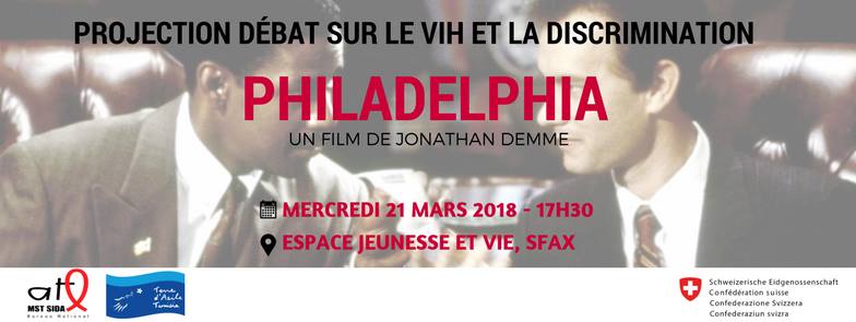 L’ATL MST SIDA organise une projection-débat du film « Philadelphia », avec Tom Hanks et Denzel Washington, mercredi 21 mars 2018 à 17h30, à Espace Jeunesse et Vie, Sfax, en partenariat avec Terre d’Asile Tunisie et la Confédération Suisse.