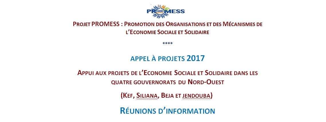 Le Ministère de la Formation Professionnelle et de l’Emploi en partenariat avec l’Organisation internationale du Travail invitent les associations intéressées par les appels à projets lancés dans le cadre du projet PROMESS et visant l’appui aux projets de l’Economie Sociale et Solidaire dans les quatre gouvernorats du Nord-Ouest (Kef, Siliana, Béja et Jendouba) aux réunions d’information et d’accompagnement aux démarches de réponse et de montage des propositions relatives à ces appels à projets qui seront organisées conformément au calendrier suivant :